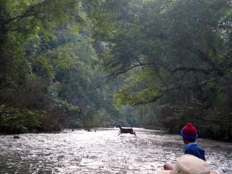 Depending on the amount of moonlight, depart for the night spotlighting 1-2 hours after dark, floating down river with engines off. There is only one light per boat. Only guides use the light, to avoid scaring the animals. The guides and boat drivers communicate via hand signals to avoid talking that might disturb the animals. The boat is very quiet so as not to disturb the animals. Animals that may be seen include Sambar Deer, Otters, and Barking Deer, various species of Civets, Slow Loris, Porcupine, and Owls (Hogbadgers, Asian golden cat and wild dogs have also been seen).